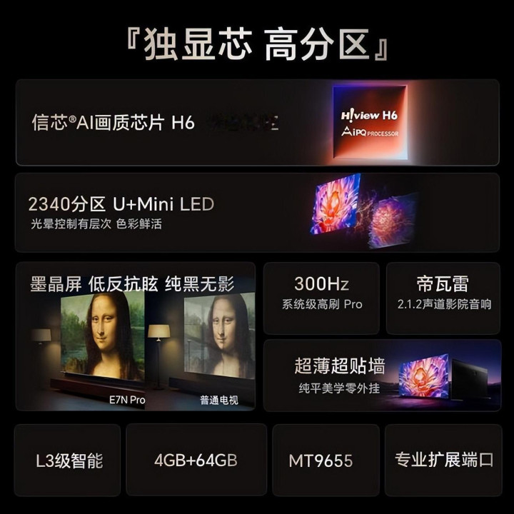 硬件配置上,MT9655旗舰芯片、4GB内存、64GB存储,再加上四个满血HDMI 2.1接口和ALLM自动低延迟、VRR可变刷新率等特性,E7N Pro几乎是一台“主机游戏专用显示器”。对于追求极致体验的用户来说,它代表了7千元档内电视的性能天花板。